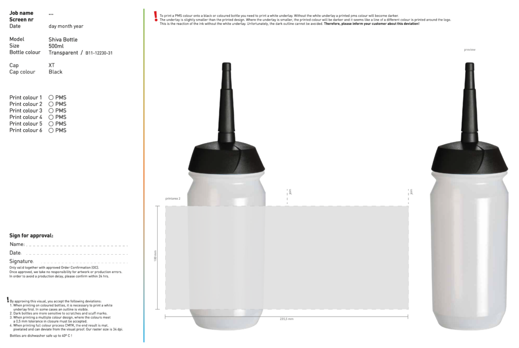 Pour réaliser votre propre design, vous ou votre studio pouvez télécharger les fichiers PDF qui s’adaptent au bidon de votre choix. Sur la première page du PDF, vous trouverez le bidon blanc. Si vous faites défiler la page, vous verrez toutes les options de couleurs du bidon et vous pourrez faire un choix.